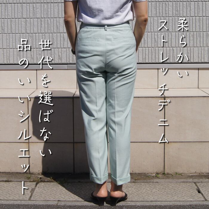 足のシルエットを隠すゆとり分量は残しながらも、スッキリキレイめに見えるラインにこだわりました。